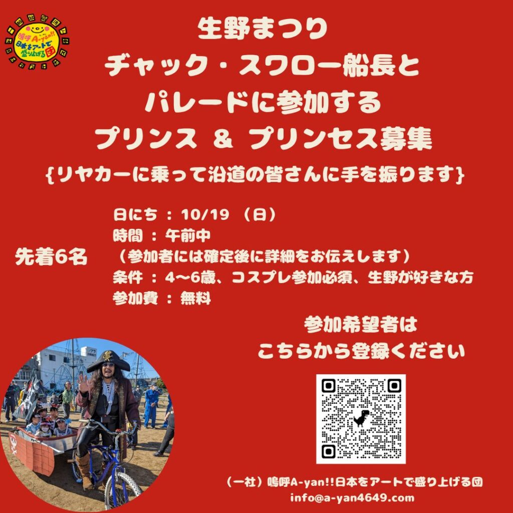 このまつりのオープニングを飾るのが区民パレード。今年もヂャック・スワロー船長はプリンスとプリンセスとパレードします。 そのプリンスとプリンセスの募集開始!